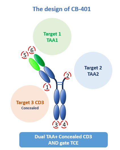CB-401: An innovative TAA1xTAA2xCD3 AND gate trispecific TCE antibody for solid tumors with widening the therapeutic window