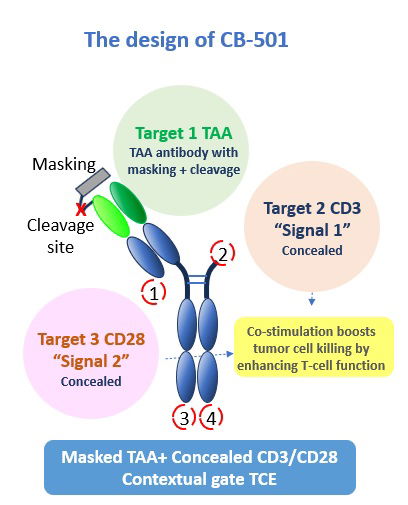 CB-501: An innovative masked TAAxCD3xCD28 Contextual gate trispecific TCE antibody for solid tumors with widening the therapeutic window